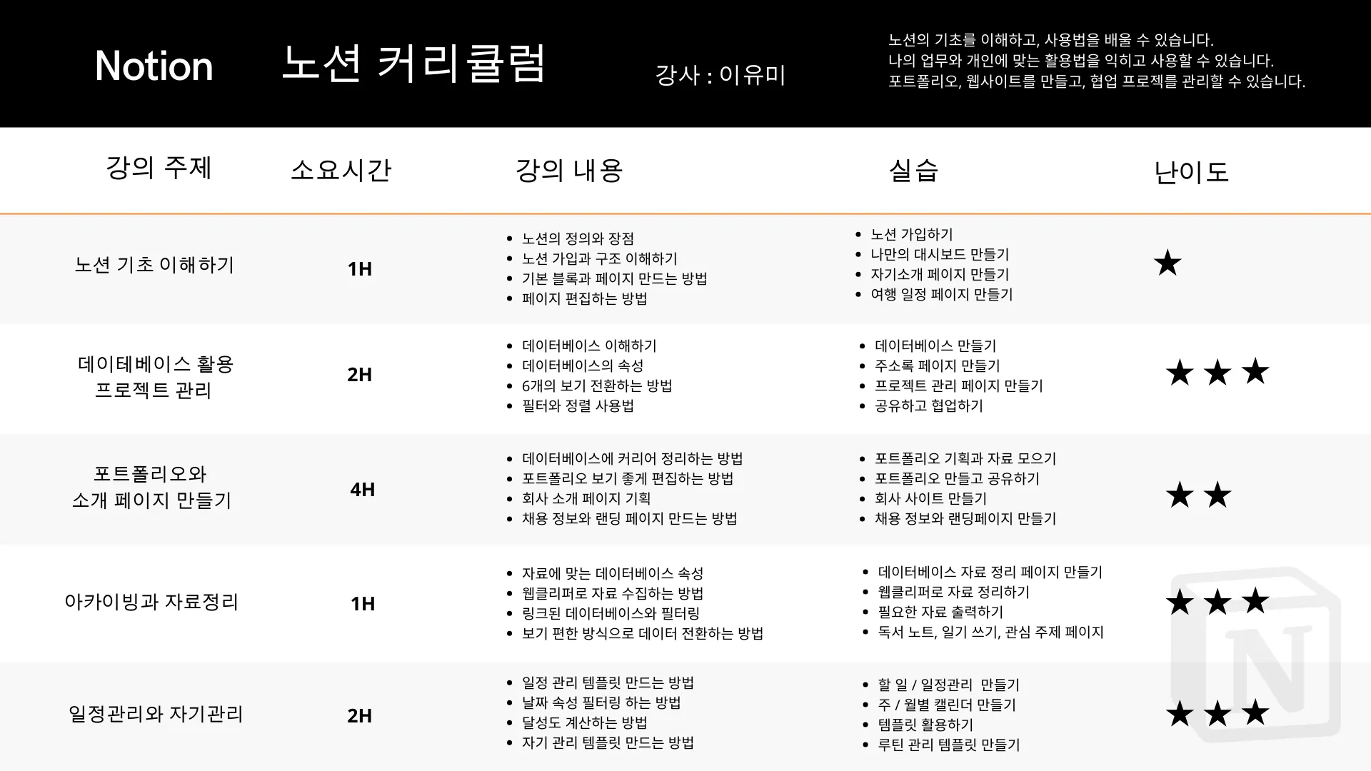 누적 수강생 7,000명을 코칭한 <왕초보 탈출 강의력>으로 노션을 쉽고 빠르게 배울 수 있도록 코칭해 드립니다.